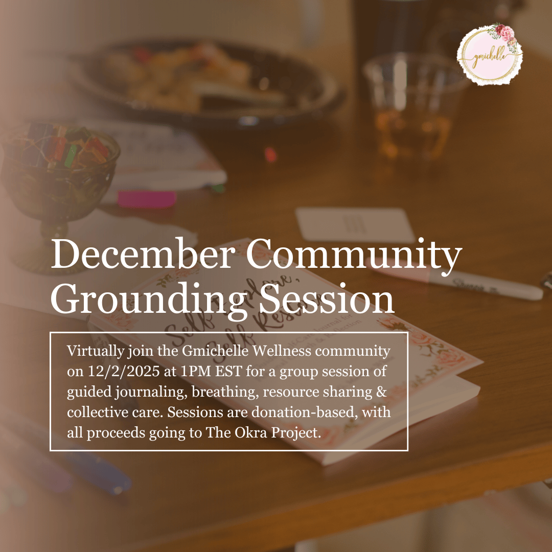 Virtually join the Gmichelle Wellness community on 12/2/2025 at 1PM EST for a group session of guided journaling, breathing, resource sharing & collective care. Sessions are donation-based, with all proceeds going to The Okra Project.