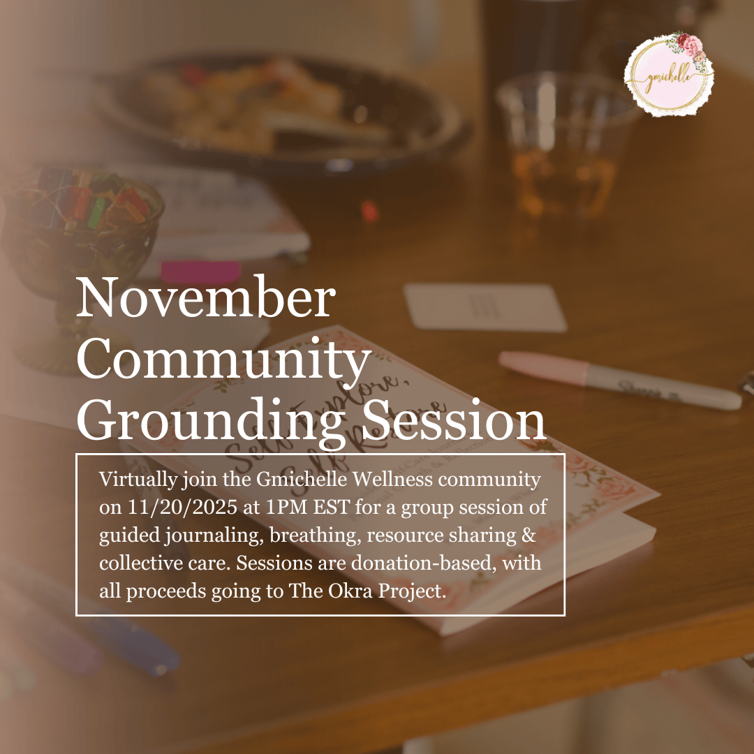 Virtually join the Gmichelle Wellness community on 11/20/2025 at 1PM EST for a group session of guided journaling, breathing, resource sharing & collective care. Sessions are donation-based, with all proceeds going to The Okra Project.
